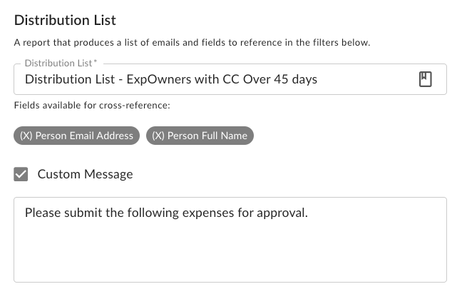 When the schedule runs, it will first run the distribution list report to get a list of users matching the specified criteria (e.g., a list of unique email addresses related to expense owners who have unused credit card transactions over 45 days).