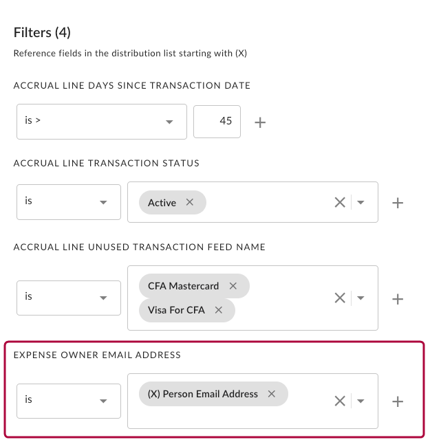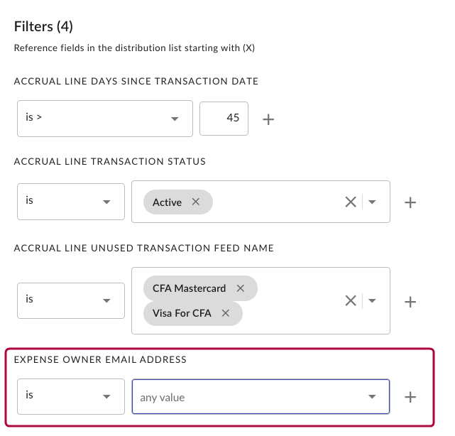 To ensure the recipients receive only their transactions, you must add a dynamic filter. As you have already defined filters for the scheduled report, you will see the filters displayed on the screen (e.g., <Expense Owner Email Address> <is> <any value>).