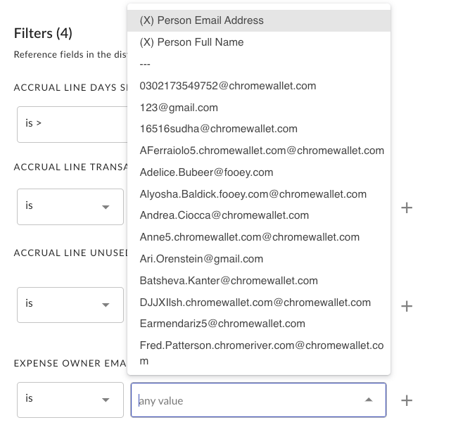 To define the dynamic filter, click on the box for the <Expense Owner Email Address> filter that currently contains <any value>.