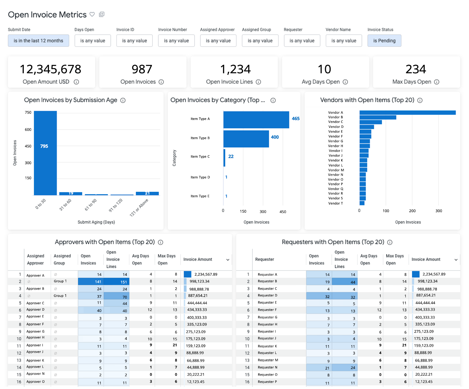 We have introduced a new Open Invoice Metrics dashboard to enable you to quantify the number and value of invoices currently routing through the approval process. This dashboard also displays which approvers currently have invoices awaiting review/approval to help you identify bottlenecks. The Open Invoice Metrics dashboard is available in the following folder: All / Emburse Analytics / Enterprise Invoice.